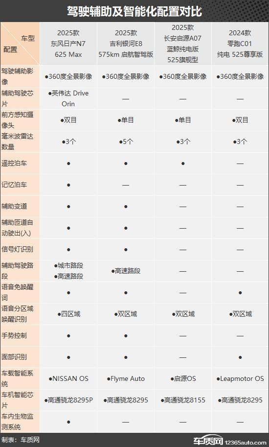 驾驶员辅助,东风日产 N7 作为本次对比中合资品牌的“独苗”,其整体表现相当出色。不但配置了英伟达 Drive Orin 辅助驾驶芯片和眼前感知摄像头也支持城市道路和高速公路段的辅助驾驶。吉利银河 E8 稍逊一筹,差距主要表现在它只支持高速路段的辅助驾驶。