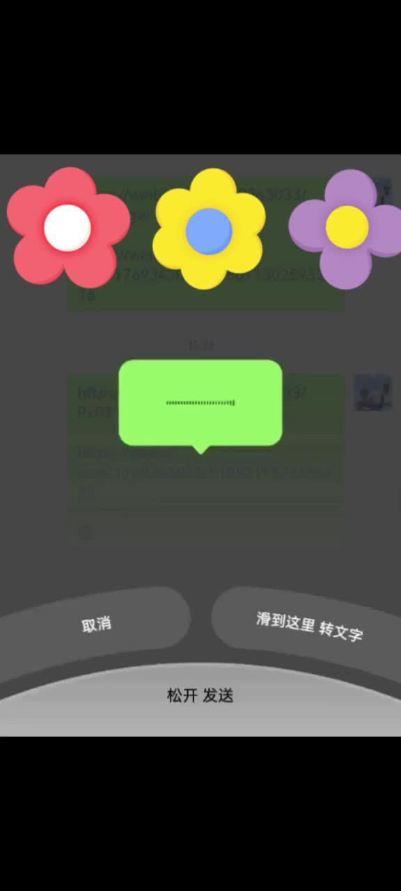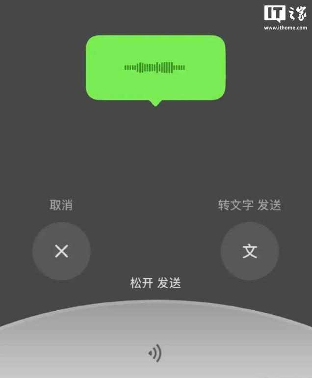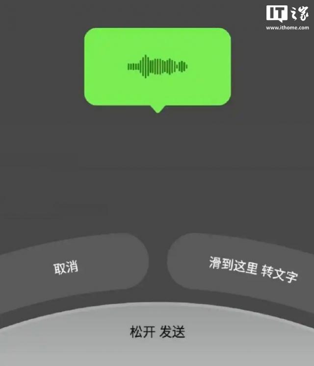 IT 世家发现,最新的微信语音发送界面将左右两个圆形按钮改为长条,并将“转文字”改为 发送文案修改为"滑倒这里 转文字",文字"松开 “发送”也放在按钮上。