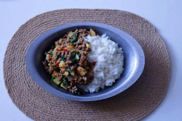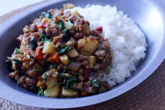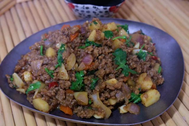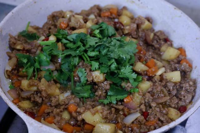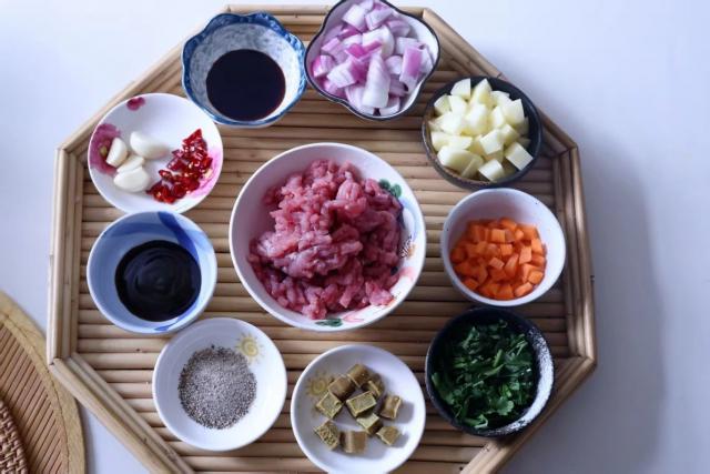 食材:牛肉糜 300 克、生抽 20 克、耗油 30 克,黑胡椒粉 5 克、咖喱块 60 克、圆葱 80 克、土豆 90 克、红萝卜 50 克、香莱 20 克、大蒜头 4 瓣、小米椒 10 克、食用油 50 克