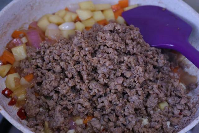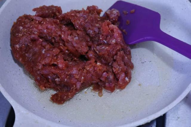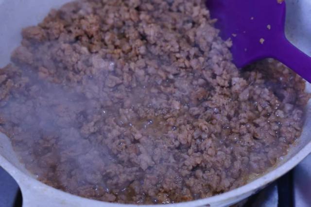 2. 锅下油,下牛肉糜,炒熟后备用。