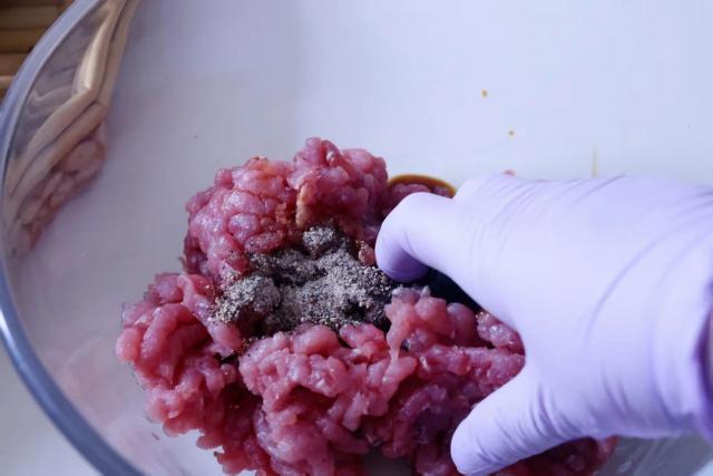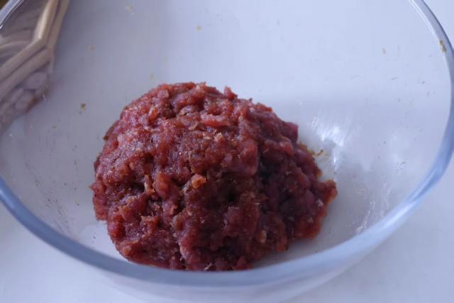 1. 加入黑胡椒粉、酱油、油耗,牛肉糜均匀,腌制均匀。 20 分钟。