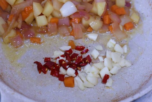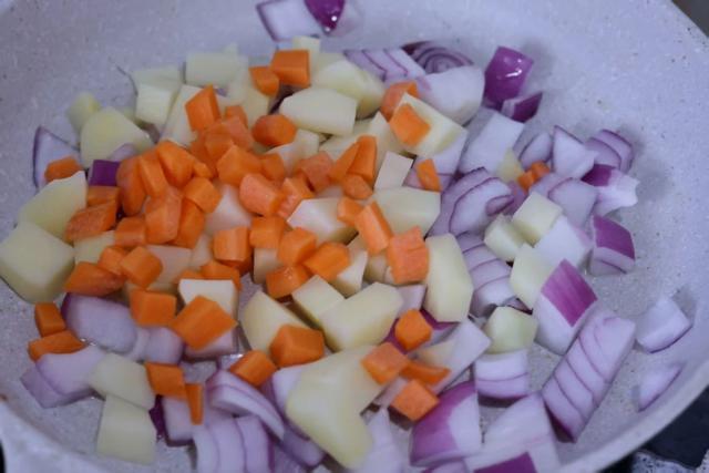 3. 再往锅里倒一点油,下葱,土豆,红萝卜,炒至半透明。