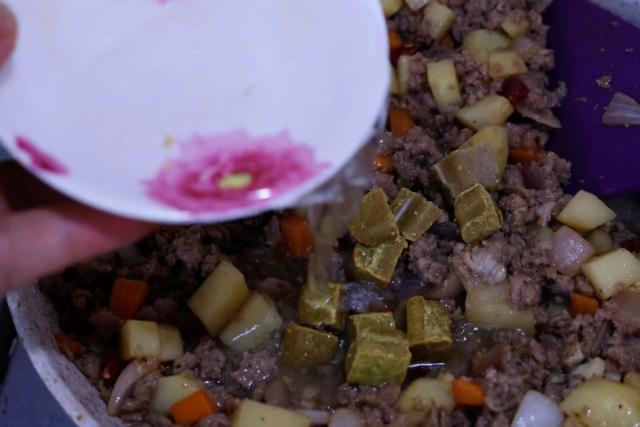 5. 倒入熟牛肉糜,放入咖喱块,倒入适当的热水,中火煮沸。 5 分钟。