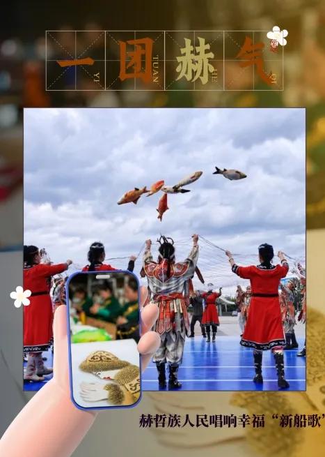“乌苏里江又长又长,蓝色的河水波涛汹涌,赫哲人撒了几千张网,船满江鱼满舱……”赫哲族是中国人口较少的民族之一,世界上有黑龙江、松花江和乌苏里江流域。因其位于祖国东方,被称为“守望太阳的民族”。一代又一代以渔猎为生的赫哲族人,传承了鱼皮画、鱼皮衣、鱼工艺品等精美的非遗技艺。抚远抓吉赫哲族村,民族团结,生机勃勃。