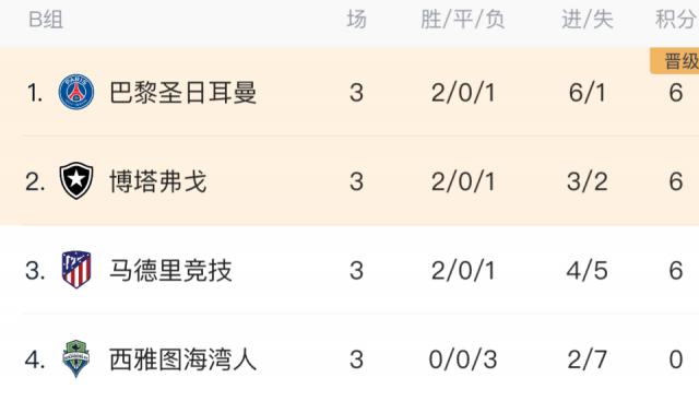 B 巴黎圣日耳曼、博塔弗戈和马竞都是组战, 2 胜 1 负积 6 分,巴黎和博塔弗戈携手出线。马竞排名小组第一 3 遗憾出局,西雅图海湾人 3 连输 0 分垫底。