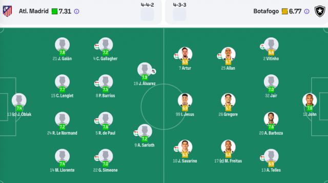 马竞首发:13- 奥布拉克、14- 马科斯 - 略伦特、15- 朗格莱、21- 哈维 - 加兰、24- 勒诺尔芒、5- 德保罗(65'6- 科克)、4- 加拉格尔(46'7)- 格列兹曼)、8- 84'16巴里奥斯- 莫利纳)、19- 阿尔瓦雷斯,22- 朱利亚诺 - 西蒙尼(59'10- 科雷亚)、9- 84'12索尔洛特- 利诺)