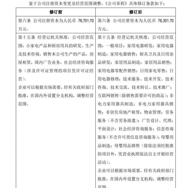 根据企业业务情况,九阳股份拟增加多项业务范围,包括:物业管理、非电力家用器具销售、母婴用品制造、母婴用品销售、网上销售(销售需要许可的商品除外)、日用电器维修等。