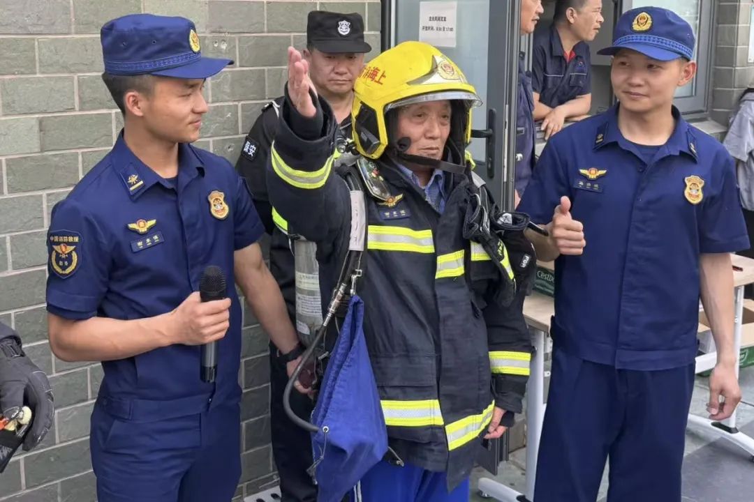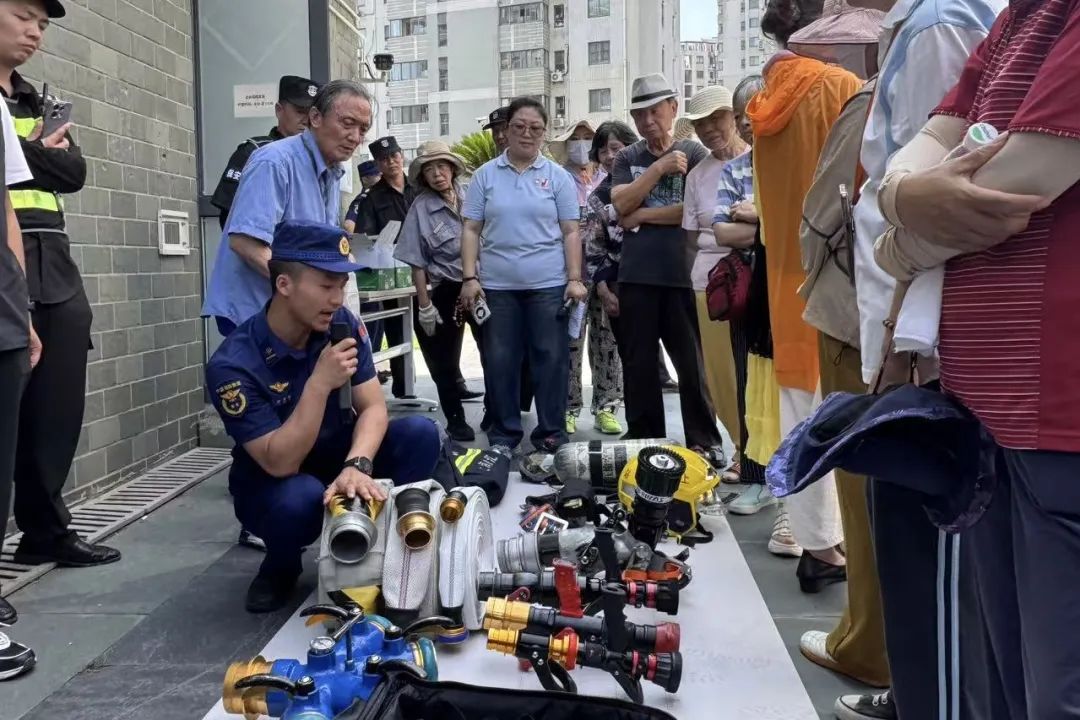 值得一提的是,本次演习还邀请了徐汇消防救援支队全程指导。消防员现场演示了灭火器“提、拔、握、压”四个步骤的操作方法,展示了液压钳、消防水枪等相关设备的关键功能,部分居民在消防员的指导下亲身体验了穿消防服。