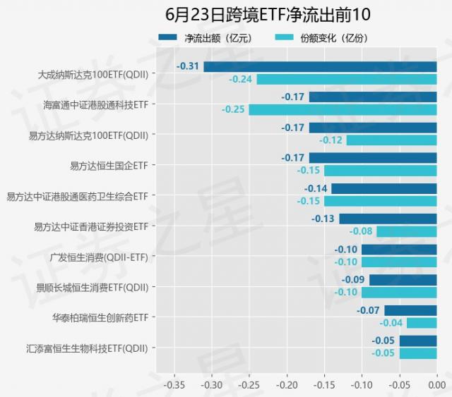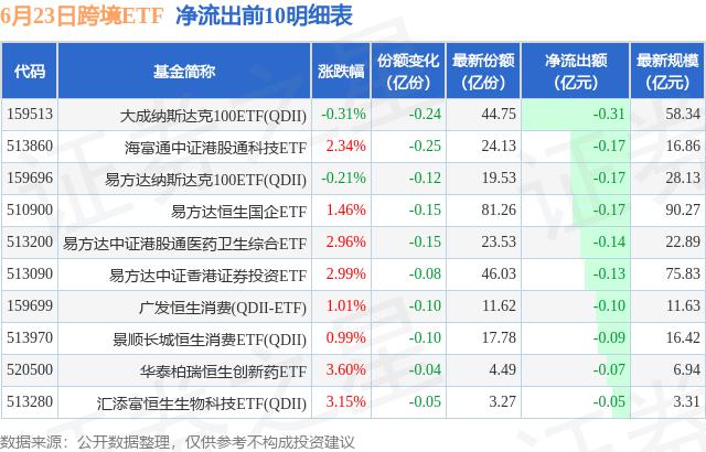 当天有 21 只跨境 ETF 资金净流出出现在基金中,其中大成纳斯达克排名第一。 100ETF ( QDII ) (159513),份额下降 2400.0 万份,净流出额为 3121.45 万元。