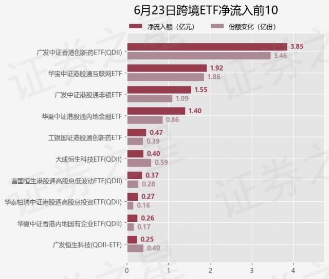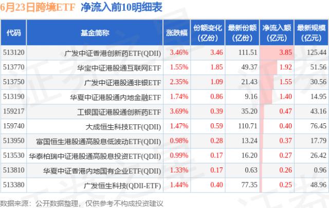 当天有 44 只跨境 ETF 资金净流入显示,其中广发中证香港创新药净流入排名第一。 ETF ( QDII ) (513120),份额增加 3.46 十亿份,净流入额为 3.85 亿元。