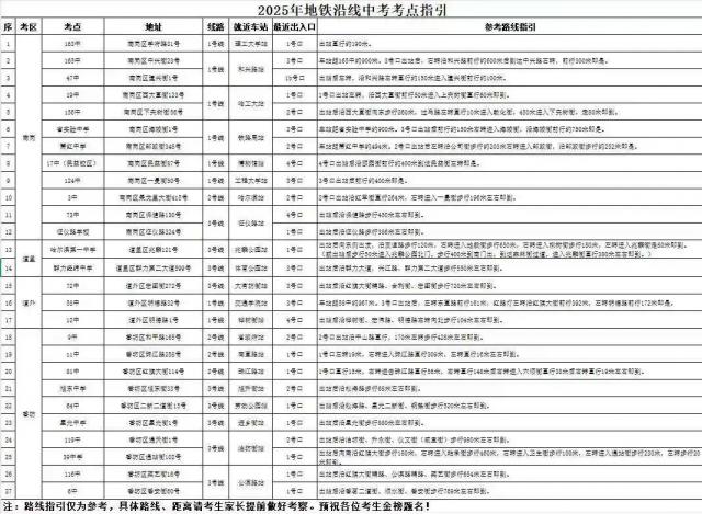 为了帮助考生准确到达考点,哈尔滨地铁精心绘制了“中考考点指南”,并根据考点分布在考点附近。21 座位重点车站张贴“一站一图”标志。导示图详细覆盖南岗、道里、道外、香坊四区主要考点,明确标注考点名称、详细地址、近期地铁站、推荐进出口、步行距离、最佳路线,实现从地铁出口到考场的无缝衔接,让考生和家长不再担心找考场,安心赶考。