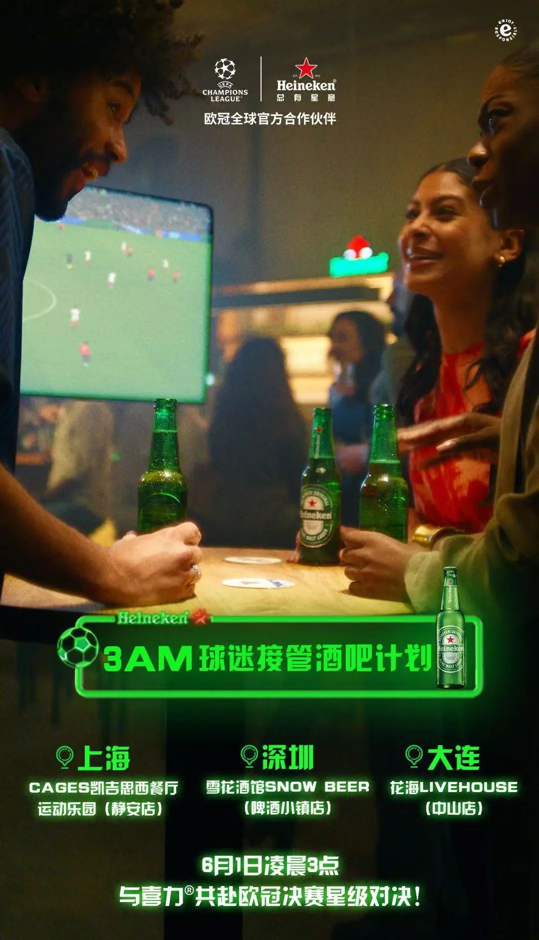 “3AM球迷接管酒吧计划”再次开启。喜力在上海、深圳、大连酒吧打造欧冠决赛主题观看派对,约会“最燃”观看圣地,聚集球迷为进球呐喊,为热爱举杯。