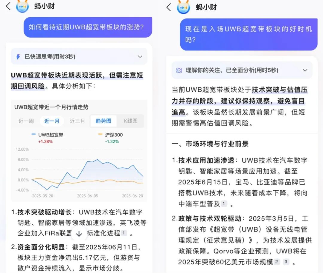 当你是一个想看股市的小白,看到主页上有几只同样是UWB超宽带板块的股票涨幅可喜,对涨幅不了解,可以问AI。: