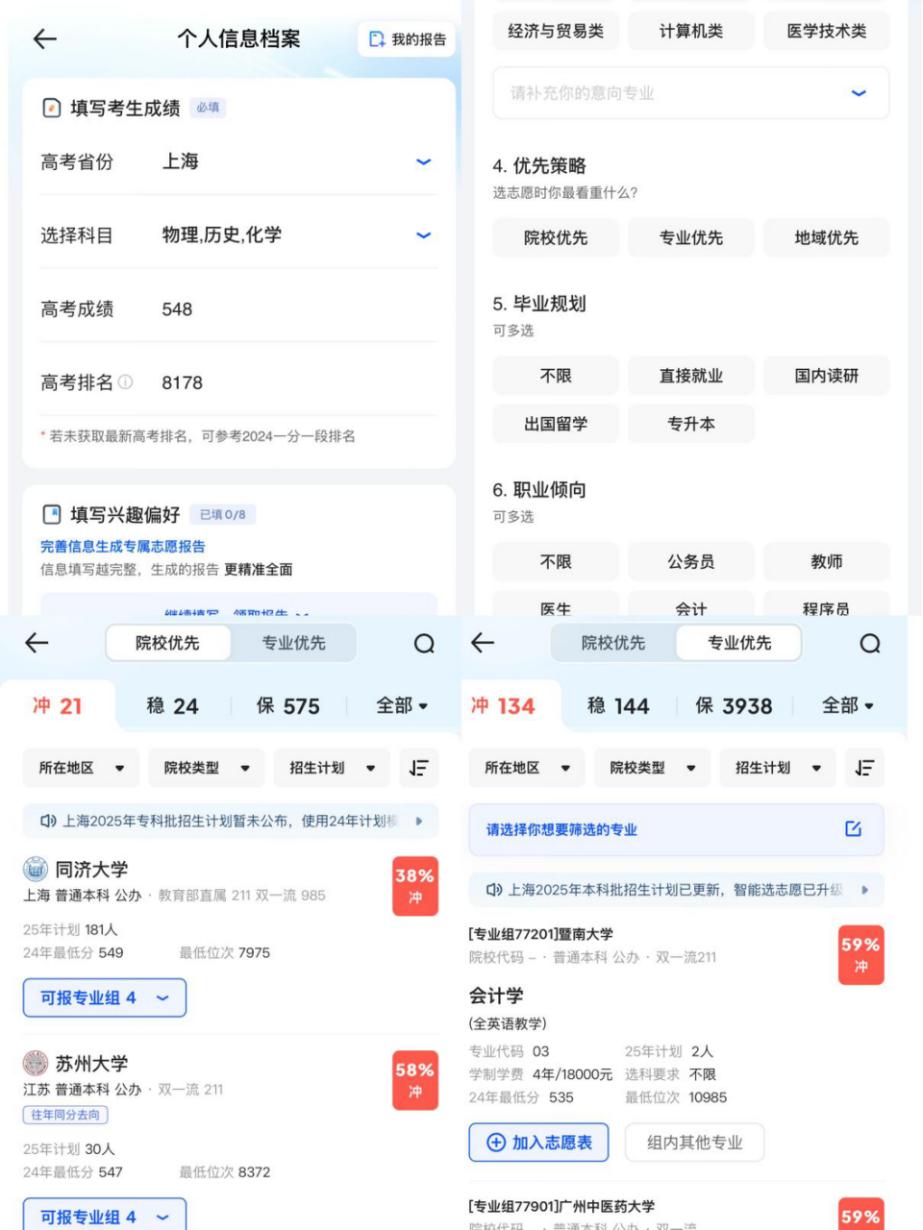 “学校优先”和“专业优先”的结果分为“冲、稳、保”三个档次。“学校优先”推荐了近600所高校,“专业优先”推荐了4000多个选择。