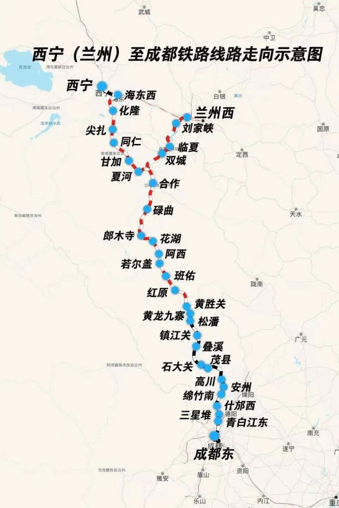 西宁至成都铁路是兰州、西宁至广州的兰(西)广通道的组成部分,是中国“八横八纵”高铁网。起源于青海省西宁市西宁站,经青海省海东市、黄南州、甘肃省甘南州、四川省阿坝州介入四川省成都东站。其中,川青铁路黄胜关站引出四川段,通过红原、班佑、若尔盖、阿西、花湖等5个车站进入甘肃省,全长约170公里,海拔约3500米。