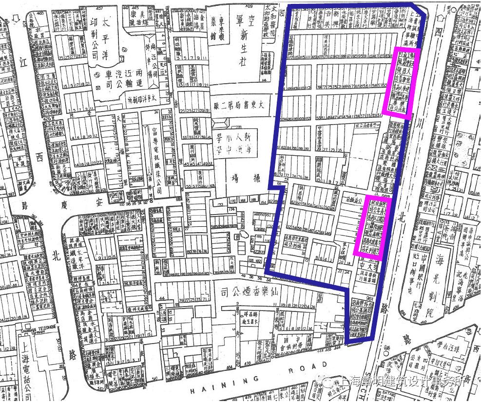 1948 年度行号图。整个公益坊都在蓝框里。四川北路975-987号为紫框,四川北路1297-13111 号