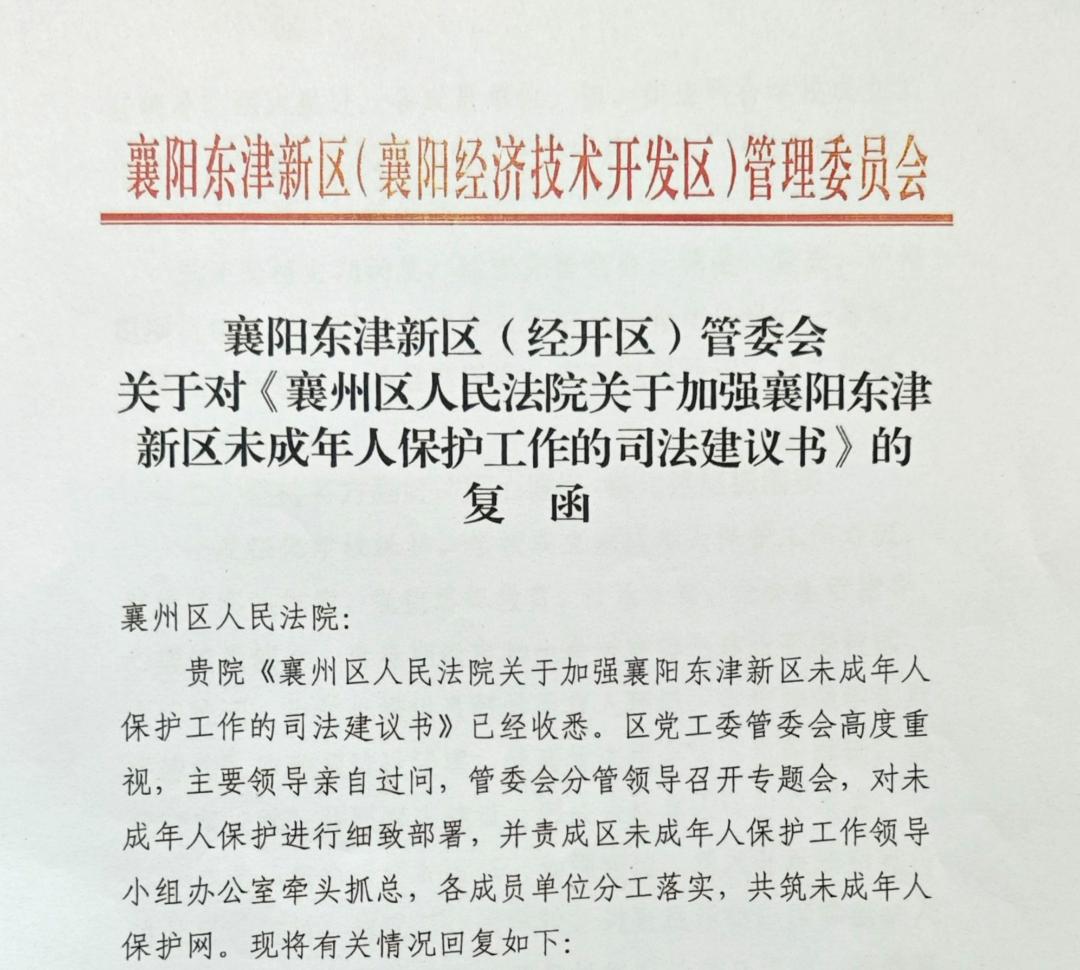 “贵院已收到《关于加强襄阳东津新区未成年人保护的司法建议》。区党工委管委高度重视……”近日,襄阳东津新区管委会书面回复加强未成年人保护的司法建议,反馈相关推进情况。