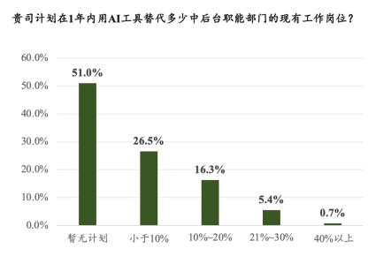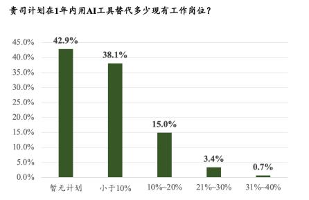 另一组数据可能进一步揭示了问题,当我们问道“贵司计划在1年内用AI工具替代多少现有岗位”时,42.9%的企业回答“暂无计划”,38.1%的企业回答“小于10%”,而计划替代10%以上岗位的企业仅占19.1%。