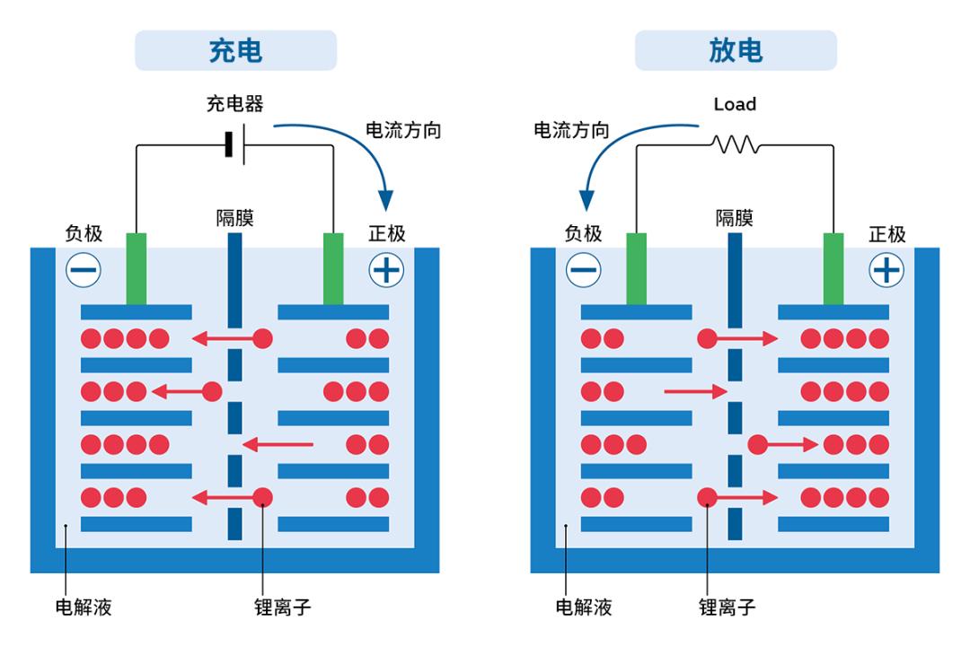 而放电过程(也就是我们使用手机或开车时),则正好相反。负极的锂离子们自发地、争先恐后地游回正极“度假村”,在这个过程中释放出电子(e⁻),电子通过外部电路流动,就形成了电流,驱动我们的设备运转。