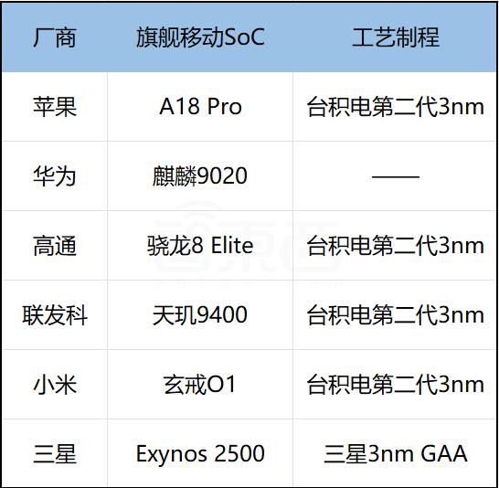 在技术方面,目前旗舰机SoC的技术流程已经普遍进入第二代3nm阶段,包括苹果、高通、联发科和小米。当然,苹果每年都会率先采用最新最强的包圆台积电技术,比如明年的2nm。