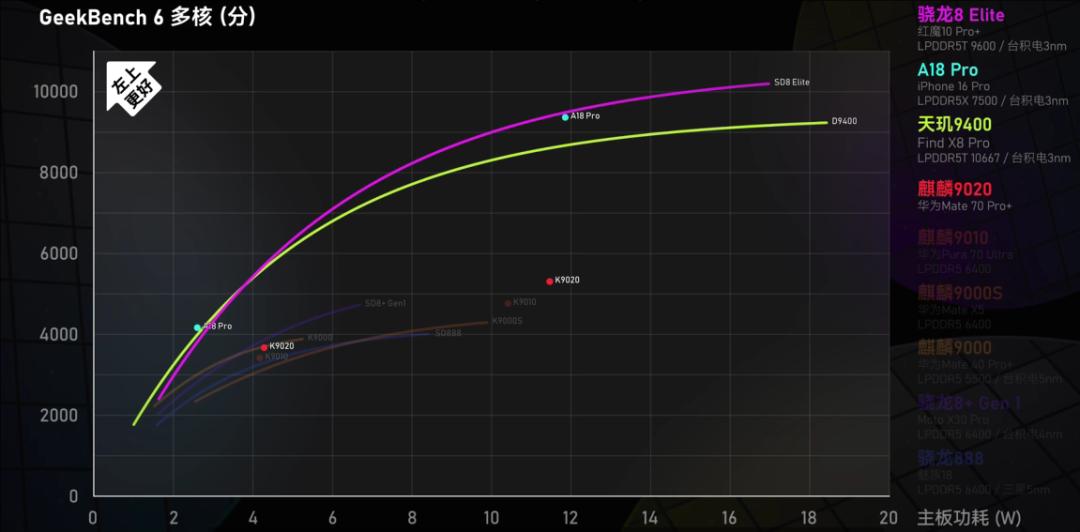 CPU多核能效曲线(红点为麒麟9020,紫色、绿色曲线为高通、联发科旗舰芯,时间为2024年12月),来源:极客湾Geekerwan
