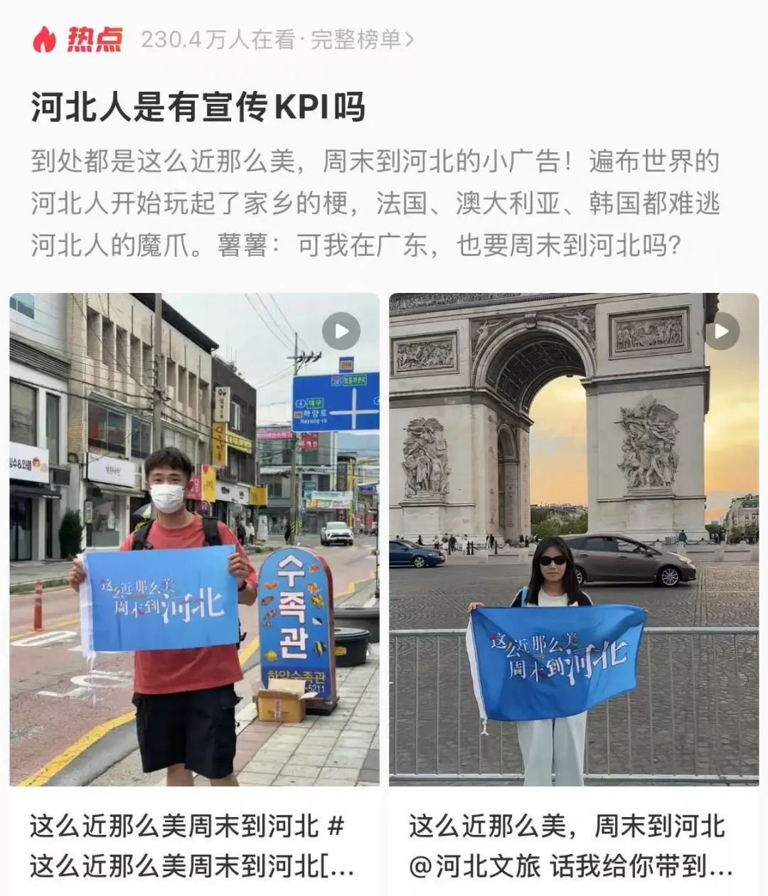 “不管工作日在哪儿,周末必须到河北。”在大量网友玩梗与打卡的烘托下,河北以一种新颖的方式出圈了。它不像此前热门的淄博、天水、哈尔滨、山西等地,或凭借烧烤、麻辣烫等美食,或依靠冰雪、古建等景观,河北的出圈仅仅是依靠一句标语。