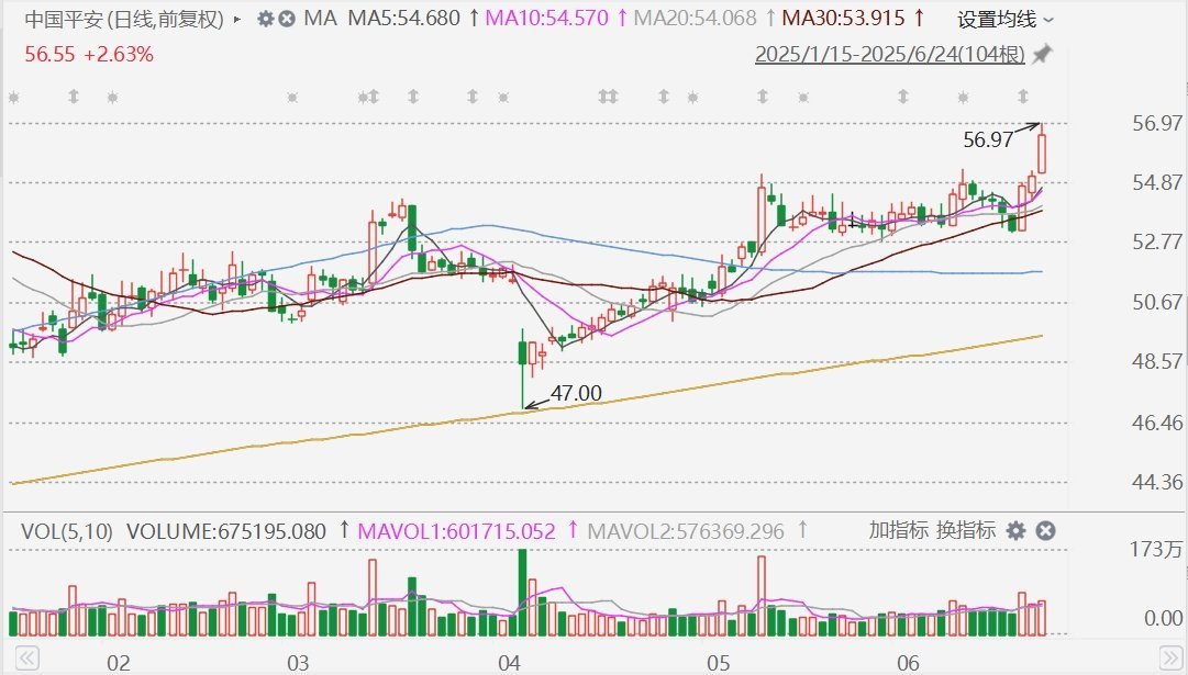 在多重利好的催化下,中国平安近日继续走强,今日盘中,a股涨幅超过3%,报56.97元,连续三次上涨,股价创下2024年12月10日至今新高;H股涨幅为3.7%,报49.3港币,也走出了三连升。中国平安总市值重上万亿元。