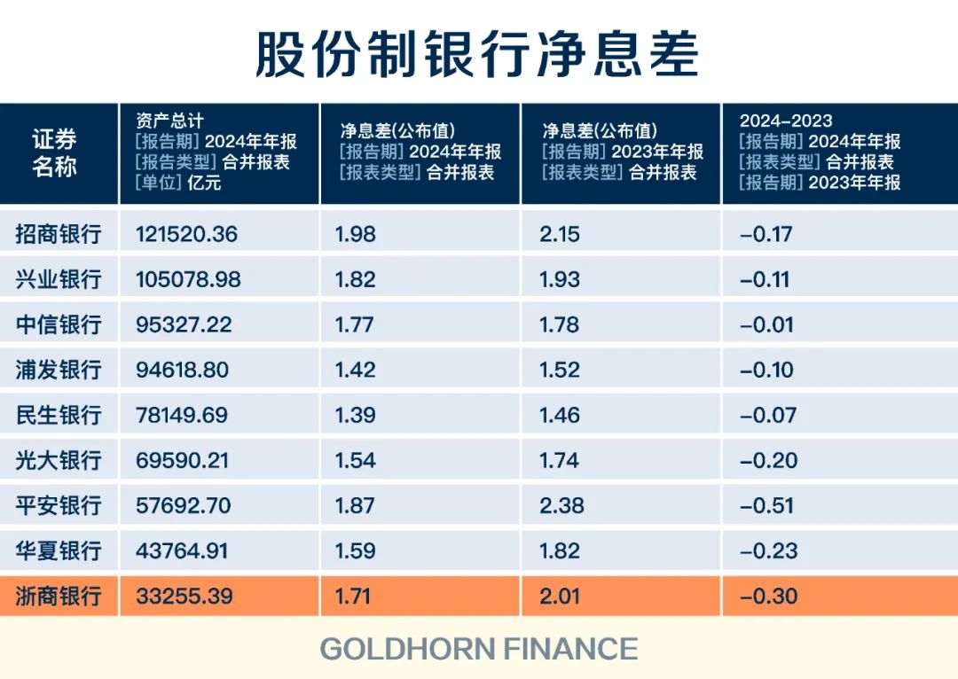 另外,在净息差方面,浙商银行去年净息收入451.57亿元同比下降4.99%,净息差缩小至1.71%,比2023年大幅下降30个基点,仅次于平安银行。