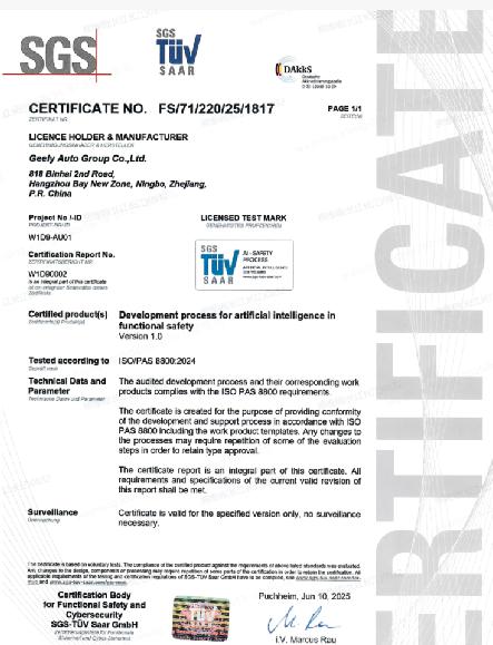 这个认证相当于为 AI 系统颁发了 “国际安全驾照”意味着吉利不仅掌握了先进的驾照 AI 技术构建了严格的风险防控体系。这一突破意义重大,不仅是吉利车辆的里程碑,也意味着中国汽车工业已经建立了符合国家最高道路的车辆 AI 产品开发系统的安全标准。
