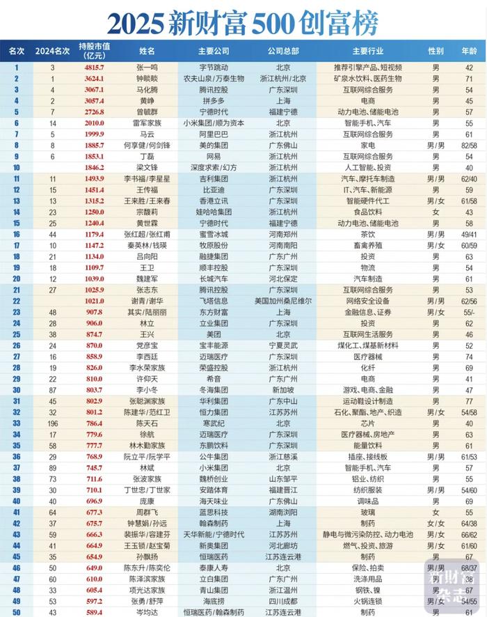 42岁的字节跳动创始人张一鸣首次以4815.7亿元的价值赢得了富人,而7年前,这是第一次上榜。40岁的DeepSeek创始人梁文锋以1846亿元的价值晋升前十。腾讯创始人马化腾、阿里巴巴创始人马云、网易创始人丁磊的净资产明显提升,稳居前十。雷军家族也以2010亿元的净资产同比增长96%,排名第六。