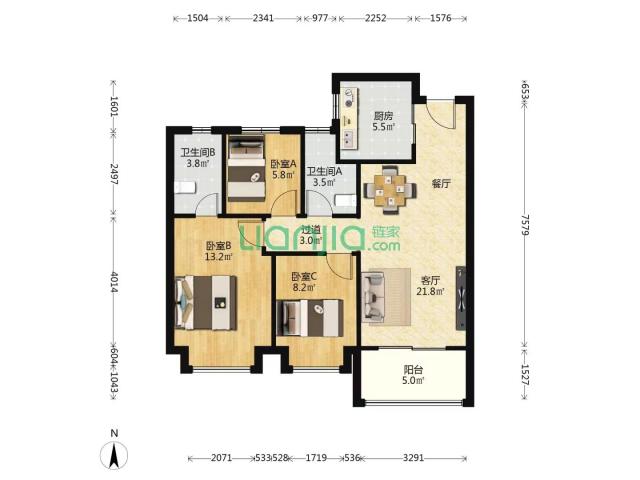 南客卧勉强还有 2.7-2.8 米开间,北客卧只有 2.3 大约大米,面积只有 5.8 个平方