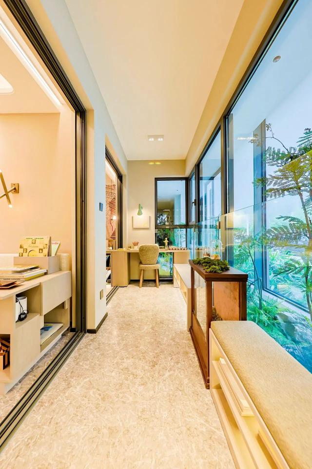 而且客卧与阳台相连,样板间还专门做了一个角落书桌,延伸到阳台,作为增加的收纳空间。