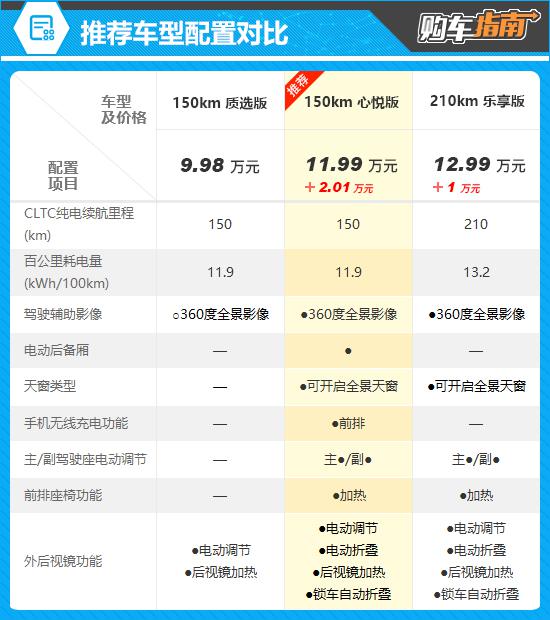 参考价为 11.99 万元的 150km 心悦版是这次推荐的车型。从配置对比可以看出,与入门级车型相比,推荐车型增强了主要车型。 / 副驾驶座椅电动调节、前排座椅加热、前排手机无线充电、电动后备箱等基本功能,能有效提高日常车辆的舒适性和便利性。另外,中国人青睐的可开启全景天窗也不缺阵,透光率极佳。补贴后的售价也只比入门级车型多。 10100 人民币,绝对物超所值。