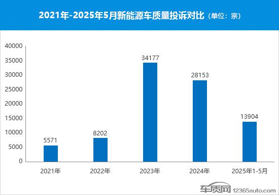 根据汽车质量网的数据, 5 可以看到2008年新能源汽车质量投诉的变化, 2023 年度达到顶峰后,年度投诉数量居高不下。2025 年 1-5 月,新能源汽车质量问题投诉达达 13904 宗,较 2024 年与 2023 每年同期各自上涨 7.4% 和 创造历史同期最高记录的87.9%。