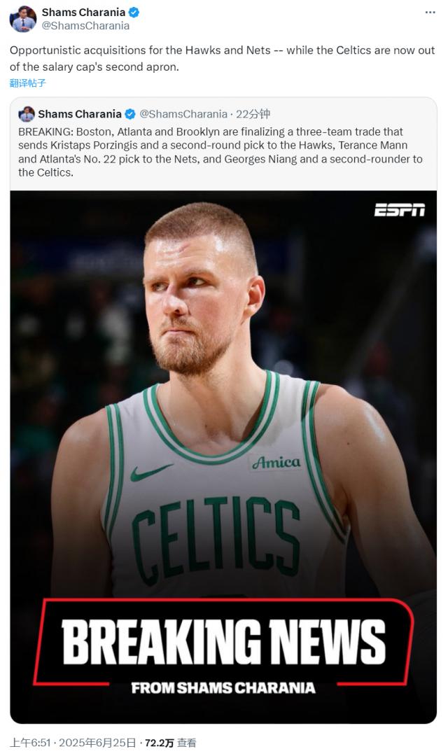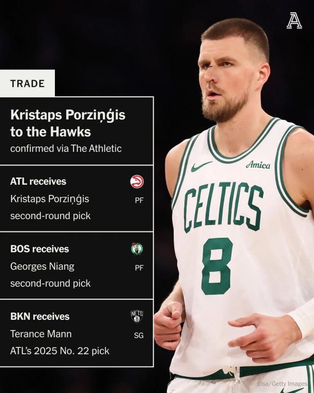 北京时间 6 月 25 日早上,据 NBA 名记 Shams 据报道,凯尔特人完成了一笔三方交易,并将波尔津吉斯交给了老鹰。交易详情,老鹰得到:波尔津吉斯 1 第二轮;篮网获得特伦斯 - 曼恩 今年 22 号签(来自老鹰);获得乔治的凯尔特人 - 尼昂 1 个次轮。