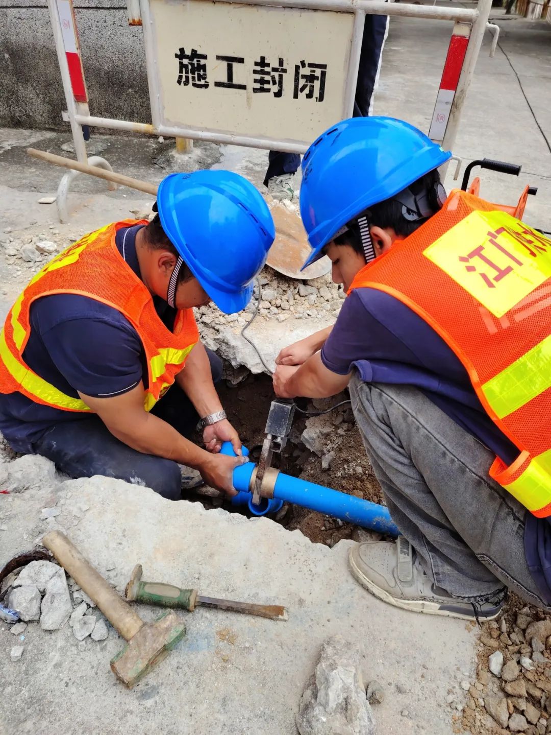 江门公共水务面临困难,科学调度。经验丰富的管道维修人员统筹配制前往施工现场,采用人工方式开挖管沟和铺设新管道,同时高效推进装水前的准备工作。在整个施工过程中,江门公共水务始终坚持“最小化扰民”的原则,努力工作高效文明,尽最大努力减少对居民日常生活的影响。