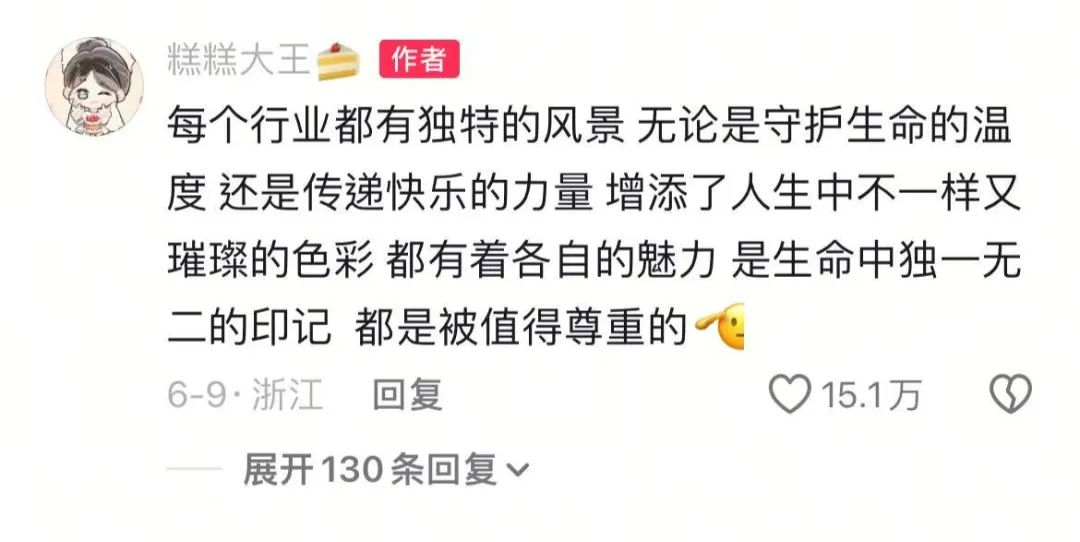 就像团播主播@糕点老大?在自己的评论区写道:“每个行业都有自己独特的风景,无论是保护生命的温度,还是传递幸福的力量,在生活中增添了不同而明亮的色彩,都有自己的魅力。它是生活中独一无二的印记,值得尊重。”