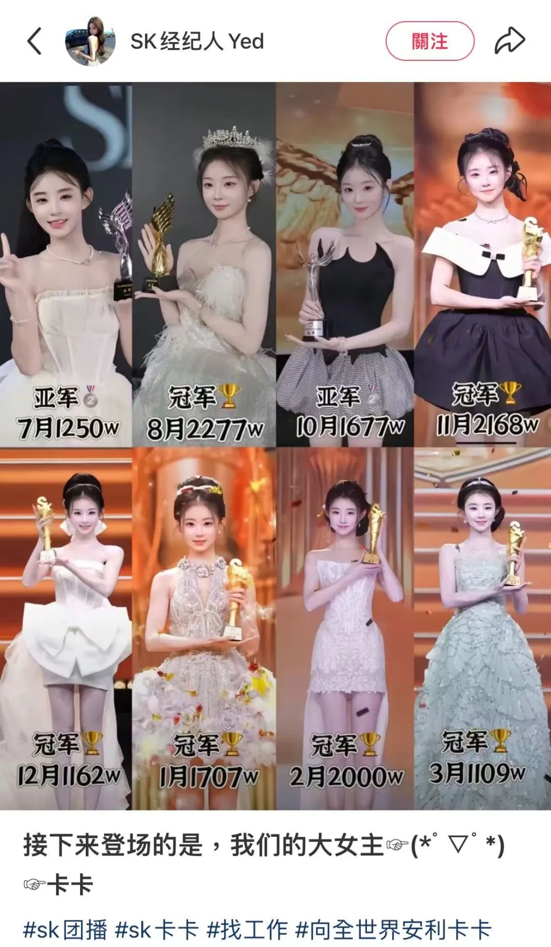 以SK女团旗下的卡卡为例。她只用了40天就积累了17万粉丝。在直播高峰期,她吸引了8万人同时在线观看,平均流量超过100万,所以被粉丝称为“百万卡卡”。