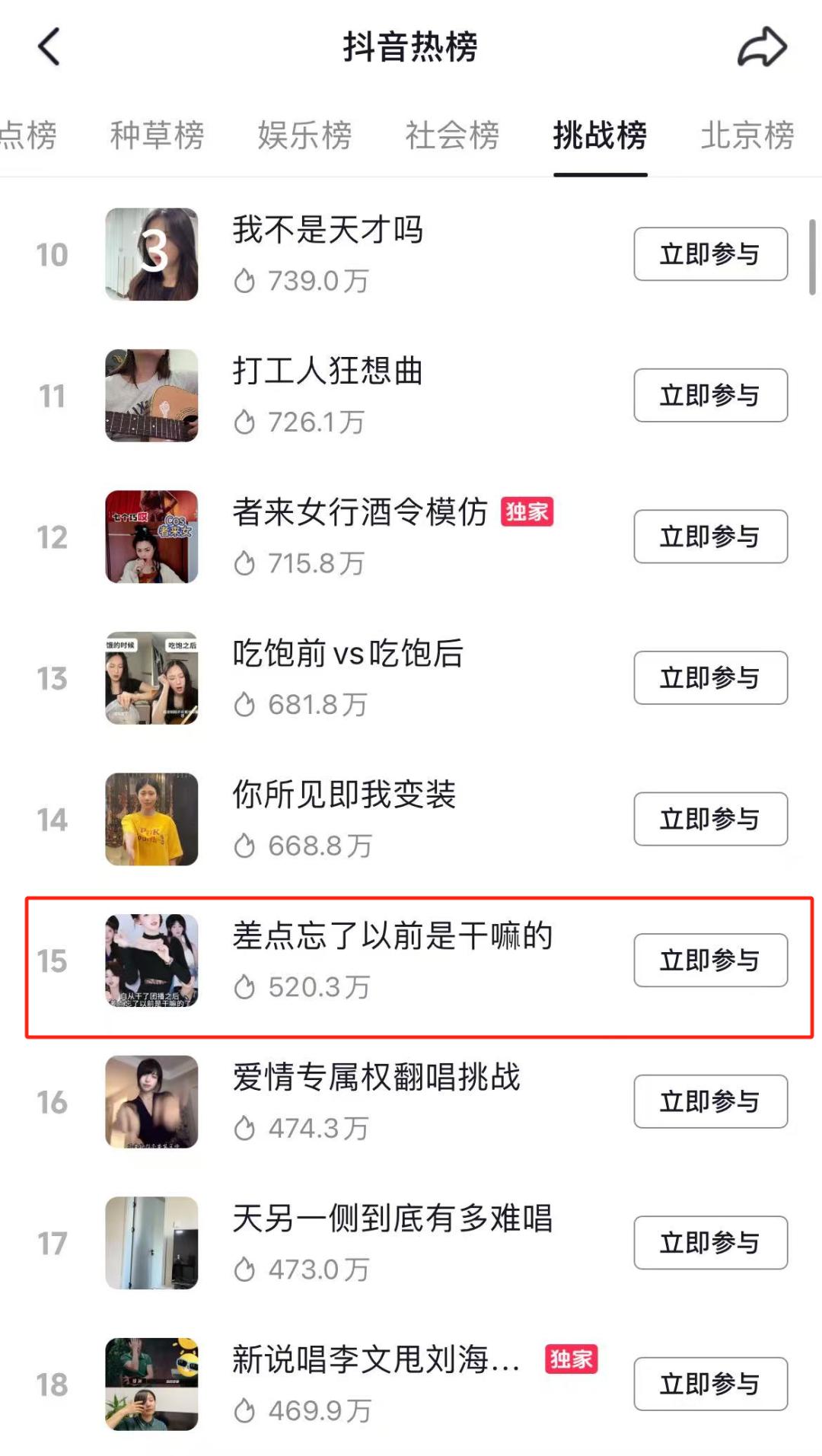 这一身份转变构成了强烈的视觉冲击,引发了大量的模仿与讨论,#差一点忘了以前是干什么的这个话题曾经登上TOP15的抖音挑战榜。