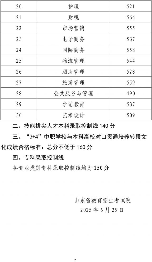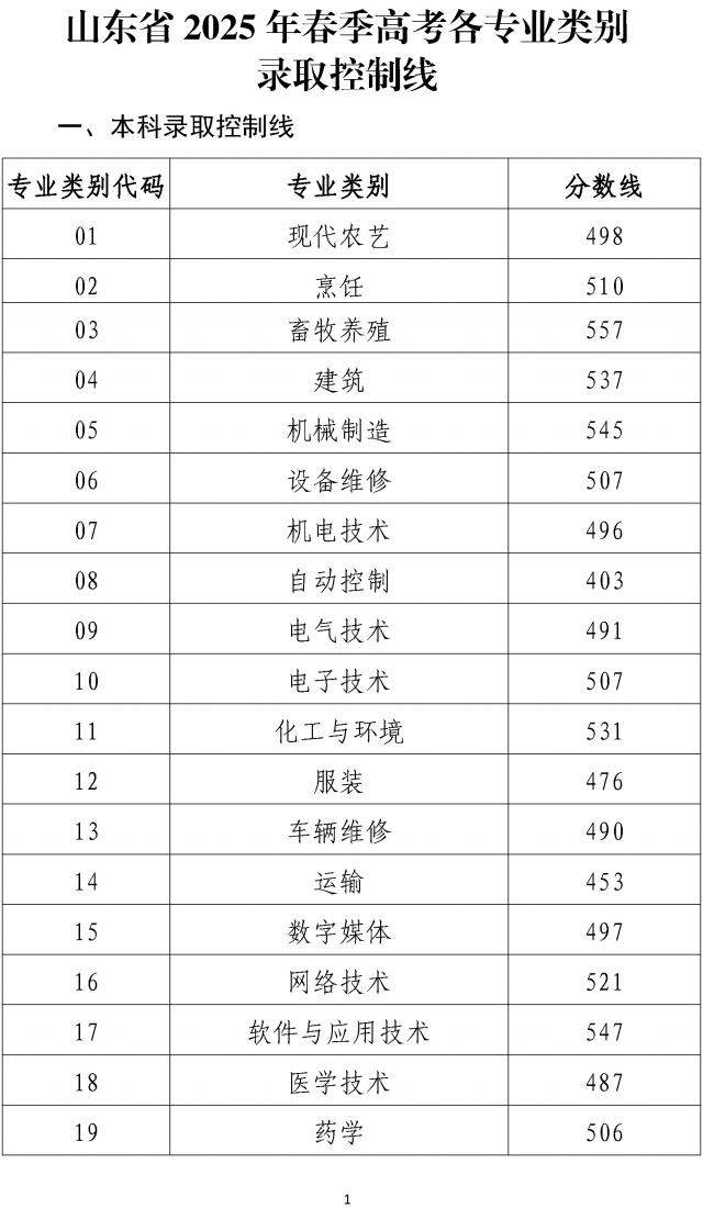 山东省 2025 春季高考各专业分类录取控制线如下。