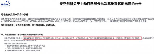 此外,安克在召回公告中也提到:“我们发现,某供应商行业的一些批次普通电池存在未经批准的原材料变更,可能导致长期回收后隔膜绝缘失效的极少数商品,进而造成过热甚至燃烧的安全隐患。”