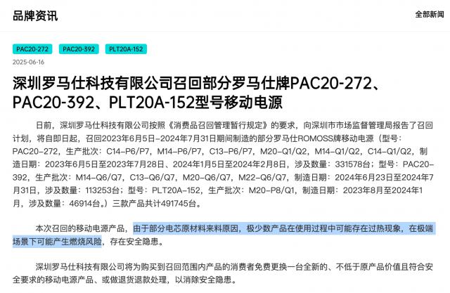 正好罗马仕官方召回的原因是“由于一些电池原料的进料,极少数商品在使用过程中可能会过热,在极端情况下可能会有燃烧的风险”,矛头指向充电宝的电池。