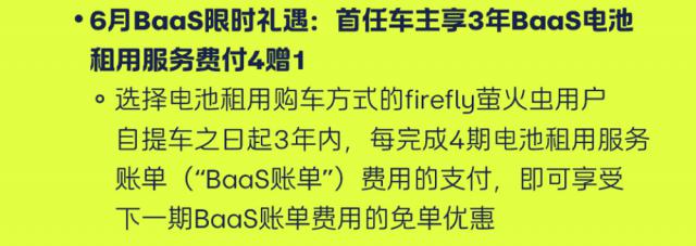 此外,firefly 也正式推出了萤火虫 6 月 BaaS 限时权益,首任车主享受限时权益 3 年 BaaS 支付电池租赁服务费 4 赠 1,即自提车之日, 3 每年,每次完成 4 期 BaaS 支付账单,即可享受下一期。 BaaS 账单费用免费优惠。