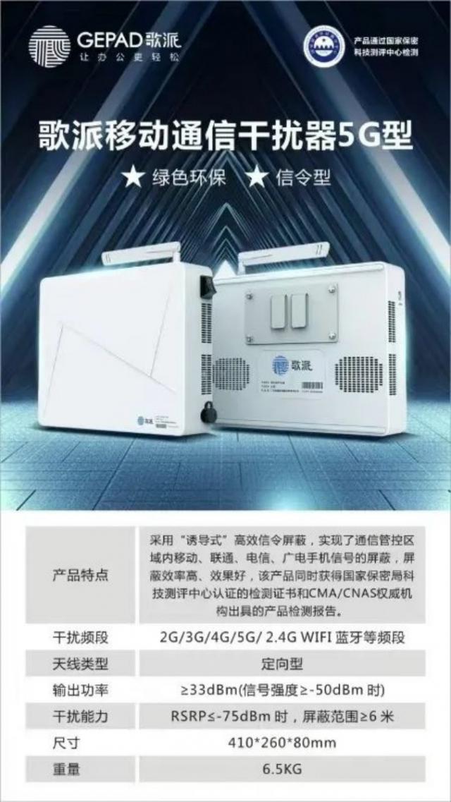 随着现代科学技术的发展,一些不法分子试图通过无线信号传输等方式作弊,严重影响了考试的正常秩序和公平性! 歌派移动通信干扰器(5G 类型),通过国家保险测试认证,可以高效屏蔽所有运营商和全系统信号,包括手机信号、对讲机信号等。,即插即用,范围可调,切断作弊信号的传播途径,确保考试公平合理!