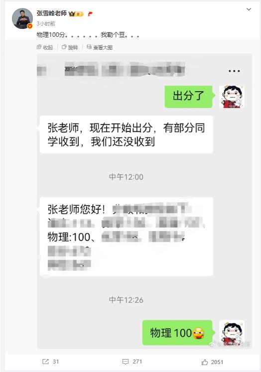 快科技 6 月 25 今天,张雪峰在微博上分享了一张聊天截图,截图显示了一位考生的物理。 100 分,张雪峰配文道:我勒个豆。