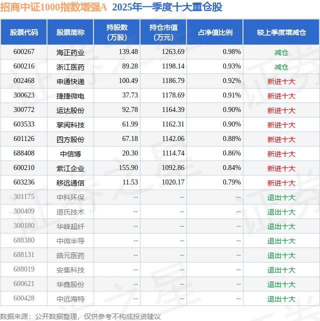 根据 2025 基金 Q1 季度公募基金重仓股数据,重仓公募基金共同基金 5 家庭,其中持有最多的公募基金是招商基金的招商中证 1000 指数增强 A。招商中证 1000 指数增强 A 目前规模为 7.07 最新净值亿元 1.6876(6 月 24 日期),较前一交易日上涨。 近一年来,1.96%上涨。 31.8%。蔡振是公募基金的现任基金经理。在任蔡振的基金产品包括 : 招商安阳债券 A,管理时间为 2021 年 8 月 5 到目前为止,期间收益率为 24.42%;投资安盈债券 A,管理时间为 2021 年 8 月 5 到目前为止,期间收益率为 17.74%;招商安嘉债券,管理时间为 2022 年 9 月 20 日至今,在此期间收益率为 21.12%。