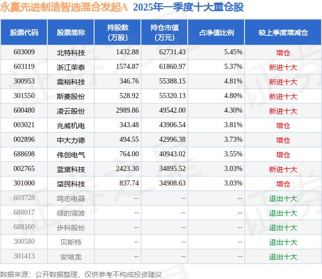 根据 2025 基金 Q1 季度公募基金重仓股数据,重仓公募基金共同基金 17 家,其中持有最多的公募基金是永胜基金的永胜先进制造智能选择混合和发起 A。永胜先进制造智选混合发起 A 目前规模为 30.41 最新净值亿元 1.8021(6 月 24 日期),较前一交易日上涨。 在过去的一年里,6.29%上升 115.07%。目前公募基金的基金经理是张璐。在任张璐的基金产品包括 : 永胜高端装备智选混合发起 A,管理时间为 2022 年 7 月 15 到目前为止,期间收益率为 -23.68%;永远赢得上证科创板 100 指数增强发起 A,管理时间为 2024 年 5 月 28 到目前为止,期间收益率为 24.44%;永胜国证通用航空工业 ETF,管理时间为 2025 年 1 月 14 到目前为止,期间收益率为 10.88%。