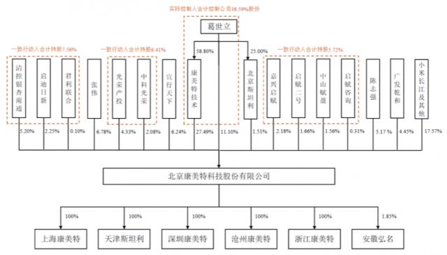直接持有公司的康美特实际控制人、董事长兼总经理葛世立 11.10% 通过康美特技术控制公司的股权 27.49% 股份,合计控制公司 38.59% 股票。实际控制人拥有较低比例的投票权。
