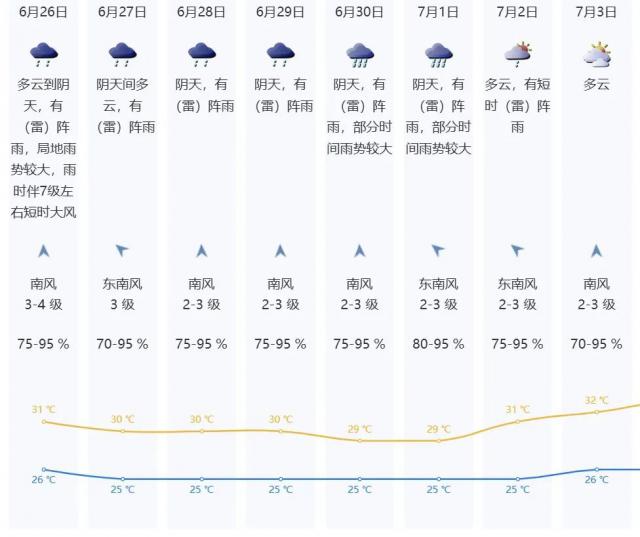26 日:多云到阴天,有(雷)阵雨,局部雨势较大,局部可达暴雨,雷雨局势伴随着雷雨局势。 7 级别左右阵风,温度降低,温度降低, 26-31 ℃;