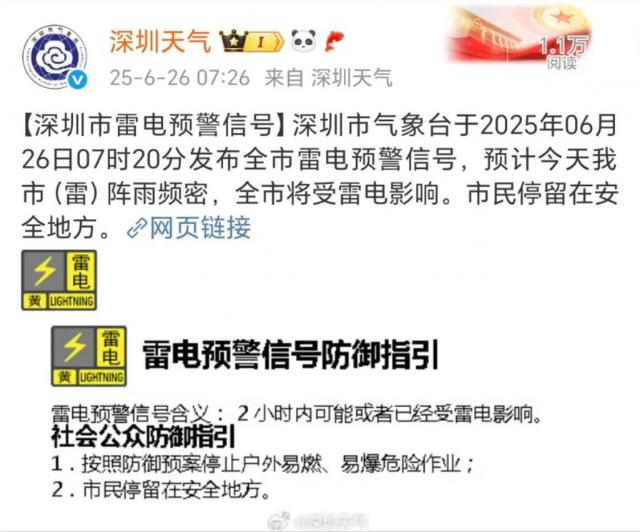 【深圳市雷电预警信号】深圳市气象台 6 月 26 日 07 时 20 发布全市雷电预警信号,预计今天我市(雷)阵雨频发,全市将受到雷击的影响。公众留在安全的地方。